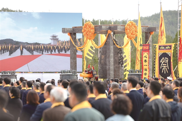 山门内外,仪仗肃立。上午9时19分,典前序礼启动,执事宣诵《典前祝文》,古琴声起,《神人畅》缓缓奏响,来自全国部分省、自治区、直辖市,香港、澳门特别行政区和台湾地区,以及海外的参祭嘉宾,在仪仗队的引领下,沿轩辕桥拾级而上。