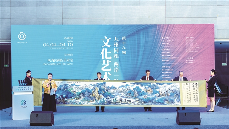 当台上一幅5.7米的书画长卷徐徐铺展,现场瞬时响起热烈掌声,将展览气氛推向高潮。华山巍峨挺拔、南宫山耸峙云端、阿里山苍翠静谧、野柳地质公园怪石嶙峋……这幅由陕台两地艺术家联袂创作的《山水相拥 同根同源》,以精湛独特的笔墨技法绘锦绣河山、颂时代华章。