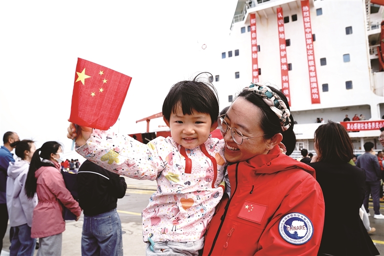 4月9日,上海吴淞口水天一色,中国极地考察国内基地码头人头攒动。历时160天、航程3.4万余海里,执行中国第42次南极考察的“雪龙”号,凯旋归国。
