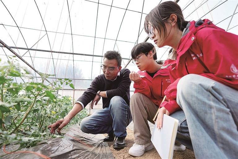 4月9日,陕西泾阳蔬菜科技小院首席专家、西北农林科技大学推广研究员张明科(左一)和研究生们在蔬菜大棚内查看新型肥料的应用效果。