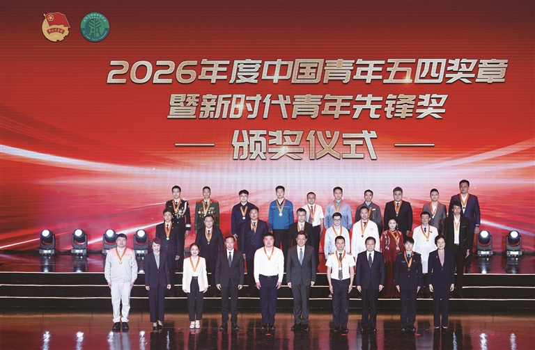 4月27日,2026年度中国青年五四奖章获奖者在颁奖活动上合影。